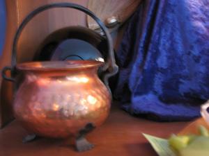 For the actual ritual, I’d hoped to gather in my backyard, but the below-freezing weather made it impractical, so we moved my grandmother’s aged cauldron into my open garage and started a very small fire in the cauldron, which served as our burning bowl instead of the usual barbecue fire pit in the backyard.