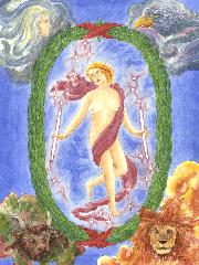 Note: Basic elemental symbolism depicts air as a human and fire as a lion. Earth is a bull and Water is an eagle. Each animal represents the Fixed signs of astrology ~ Aquarius, Leo, Taurus, and Scorpio. You can see this symbolism on the Wheel of Fortune tarot card, and indeed, there is a sphinx sitting atop the wheel in that card. The four elements are also depicted in the four corners of The World card framing an androgenous human in the center of the card. The World card is associated with Saturn; The Wheel of Fortune with Jupiter. Strength is usually drawn as a woman holding the mouth of a lion and is associated with Leo. The following cards are from the Aquatic Tarot.