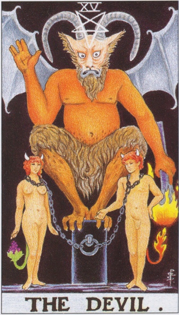 Here’s that oldΒ Devil, chains and all. What a task master ~ just like the old demon Saturn. And just like we’ve been taught with Saturn, his reins are loose. He’ll do his best to whip us into shape, but we’re always free to go.Β Neferlyn Gray, a very gifted tarot reader andΒ teacher,Β stressed thatΒ The Devil is a liar. Yes, he certainly is, but that old devil can’t lie to us anymore. We’re on to him.Β Β He’ll tell us all kinds of stories to keep us bound by fear. And he’s been telling us a whopper ~ passing himself off as Capricorn. Here’s a bunch of Devils to study so you’ll recognize him when you see him.