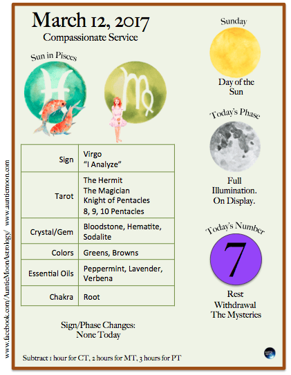 The Moon is Full in Virgo today at 10:55am ET. Squares to Saturn and ruler Mercury can have us off our game ~ a good reason to take this Full Moon day as a day of rest, supported by today’s universal number 7. Tune into The Hermit tarot card and have some alone time.