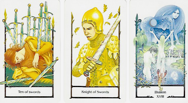 Card 1, The Current Circumstances: The Crescent Phase at 24 Gemini is represented by the 10 of Swords. This version is a lot less unnerving than the Rider-Waite card, but carries the same symbolism. We had to choose a path at the New Phase. Now that we’re at the Crescent phase, we have to trust our instincts that we’ve made the right choice and are headed in the right direction. I mentioned in yesterday’s post that instinct can arise from our past experiences. It doesn’t have to be a psychic moment. It’s not intuition. Card 10 in a suit can be a card designating the end of a cycle . We’ve experienced all that we can and must move on. Some questions for this phase might include: