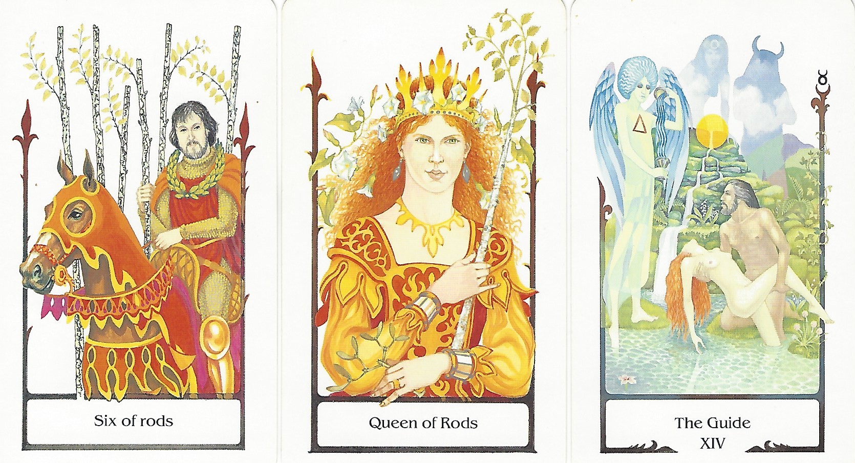 The cards for phase readings are not drawn randomly. Each phase is represented by three cards associated with the degree of the zodiac that begins each phase. The first card is the minor arcana card associated with the beginning degree of the phase. It gives a look at the current circumstances. The second card is the Court Card associated with the sign of that degree and acts as a person who can guide us through the phase. Cardinal signs are represented by the Kings, fixed signs by the Queens, and mutable signs by the Knights. The third card is a Major Arcana card that is associated with a 2½ degree span of the sign, called a dwaad. This card represents a hidden factor and an unacknowledged driving force.