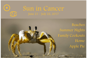 The Sun has moved into Cancer and summer has begun. The Summer Solstice ushers in all the summer signs: Cancer, Leo, and Virgo. The days will grow shorter now as we head toward autumn. Just the other night, I said to my husband, “Is it EVER going to get dark?!”