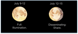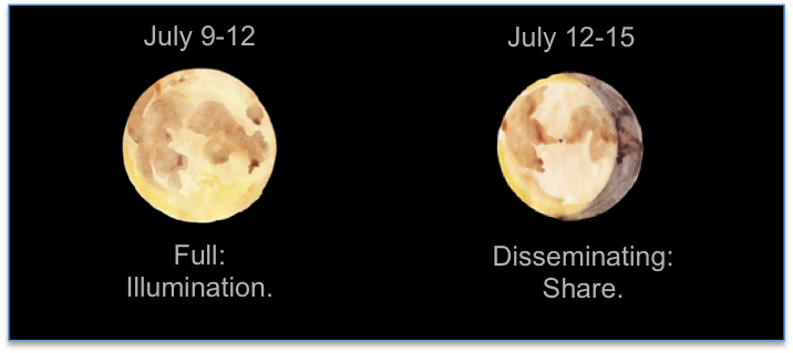 We’ve reached the point in the Cancer Lunation where the light starts to diminish. Energy wanes with the fading light and we enter the cycle of release. The Full Phase, when everything is illuminated, continues through the 12th. The Disseminating Moon arrives on the 12th at 5Pisces, a time to share what we’ve learned since the New Moon of June 23rd. Sharing in Pisces style is a lot like unconditional love, it would seem. Spread those seeds.