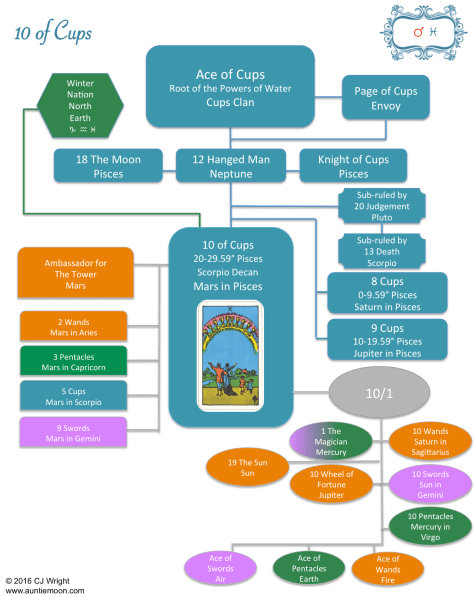 After a while, the three systems became so intertwined in my head that when I look at a card, I don’t see just one card. I see a whole constellation of cards and zodiac signs contained within the one. Let me give you an example. This is what the 10 of Cups looks like to me.