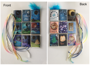 An unusual type of “reading” is included, built right into the Pocket Letter. I’ve tucked a tarot, oracle, or inspirational card into the eight phase pockets. They aren’t pics of cards. They’re the real cards. I opted to use cards from different decks as a way to emphasize that each phase is different from the others. I will pull one card from each of these decks especially for you and tuck them into the pockets. The decks that cards are drawn from for this New Moon are: