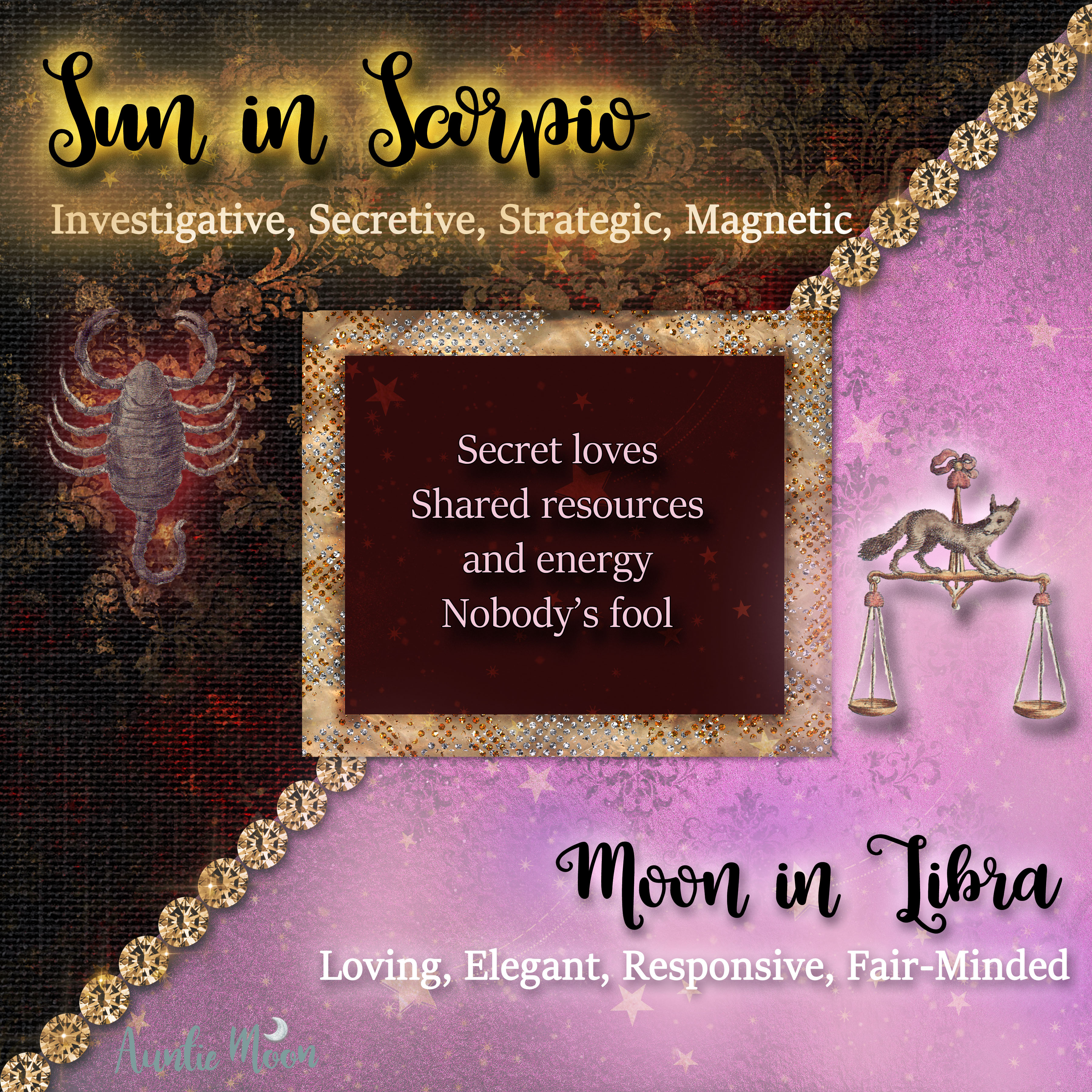 Libra is, in many ways, not unlike Scorpio’s 12th house. Things are hidden there: love, resources, money, partners. It may be difficult to discover the Scorpio Sun/Libra Moon’s motives, but they are often completely irresistible.