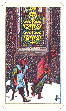 Taurus is the most earthbound of all the signs and we can see this clearly in the 5 of Pentacles. Even though there is a monument to spirit right there by them, they are moving past it. Maybe they’ve been turned away, perhaps many times. We’ve all felt that way at some point—on our own, scorned, out in the cold, rejected.