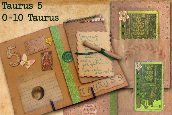 The pocket holds the 5 of Pentacles from the original Waite deck. The card has been covered with green tissue paper with sparkles in it. A green ribbon on the side is decorated with a five petaled flower and five emerald colored rhinestones. The card has a tea-dyed page adhered to the back for notes and observations. The green color represents money and the lush green foliage of the earth during Taurus.