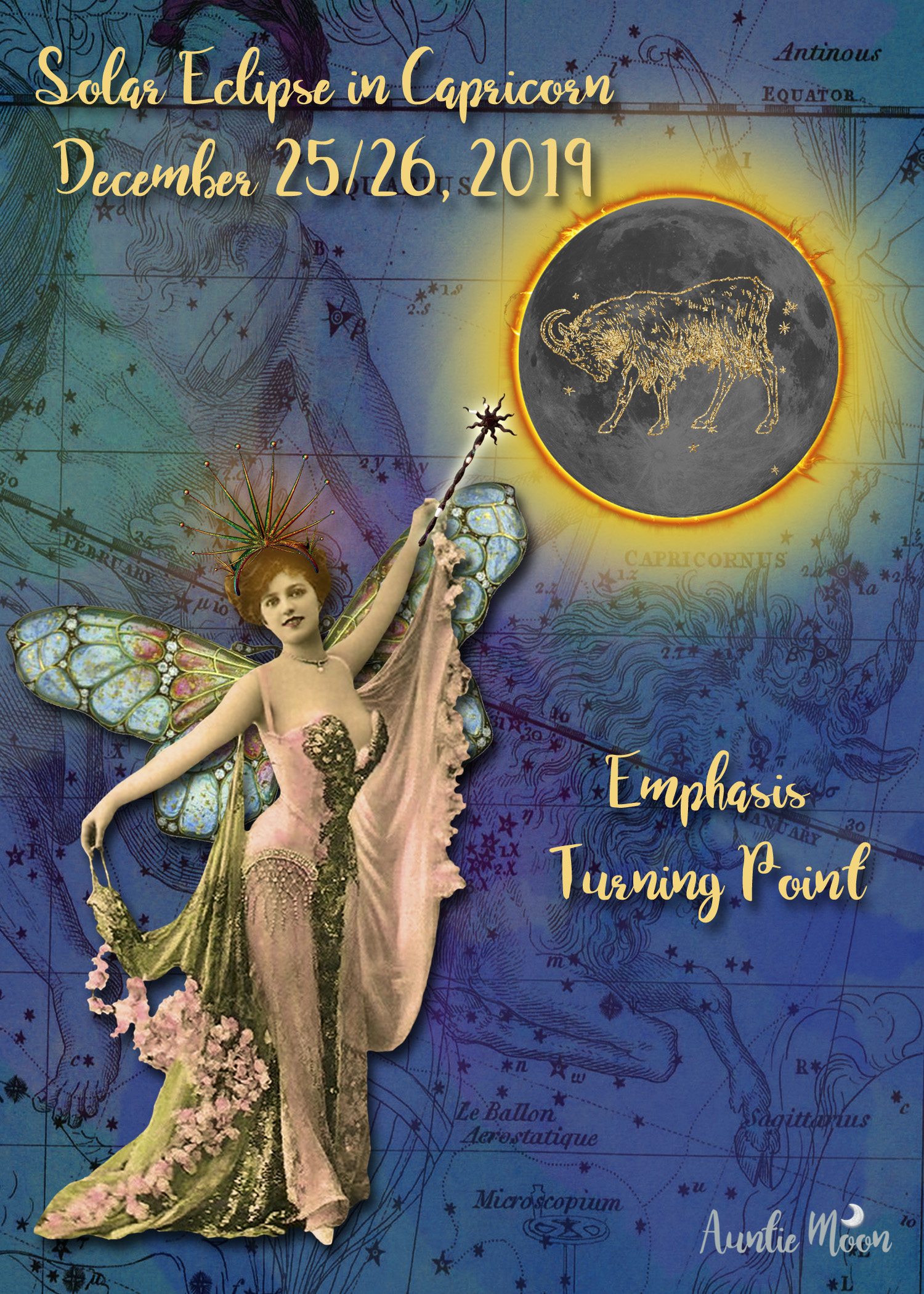 Those of us in the Central Time Zone and points west will greet the New Moon/Solar Eclipse on the night of December 25th. Those of us in the Eastern Time Zone or points east, the New Moon/Solar Eclipse is on the morning of December 26th. Celebrate to your heart’s content no matter which day you choose.