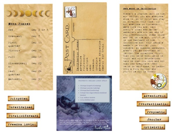 Here’s a close-up of the cut-aparts. I’m using the empty address space on the postcard to write down my New Moon wishes but you may prefer to write them on a page. There are also Moon Phases, a general description of the Sagittarius New Moon, some keywords, and a recipe to make a special pillow/room spray for Sagittarius.