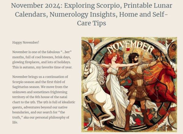 A sneak-peek of the November home page is available to subscribers of this blog. The focus is on Scorpio with articles on Sagittarius coming soon.