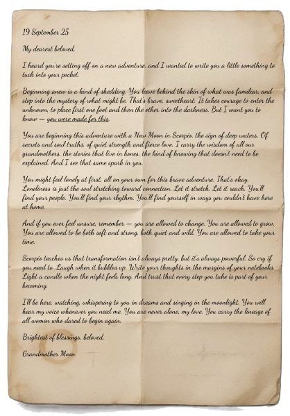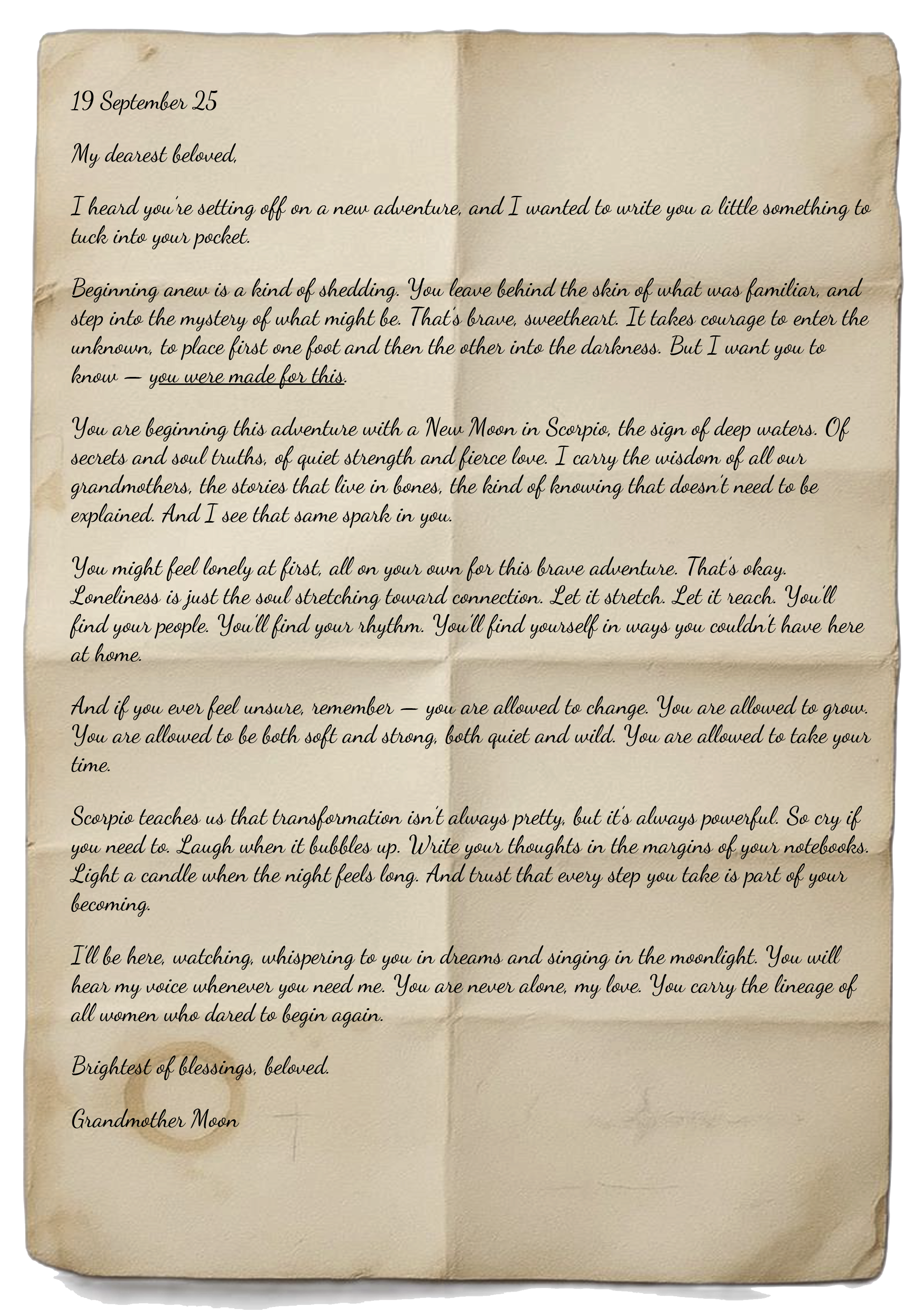 You are beginning this adventure with a New Moon in Scorpio, the sign of deep waters. Of secrets and soul truths, of quiet strength and fierce love. I carry the wisdom of all our grandmothers, the stories that live in bones, the kind of knowing that doesn’t need to be explained. And I see that same spark in you.