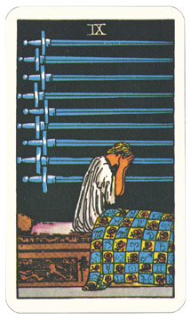 The tarot nines beautifully show transitions and endings of various kinds—weariness, worry, success, wishes come true, and dedication. You probably have a lot of experience with each of these, sometimes more than you wish you had. Use them to your advantage as you encounter a major curve in the spiral of life. When you round the corner, you will behold a whole new vista, a breathtaking view of tomorrow. The tarot is an intuitive visual tool that incorporates numerology and the four elements into its symbolism. It presents us with an image that our intuition is able to penetrate, bringing clarity and recognition where it was lacking.