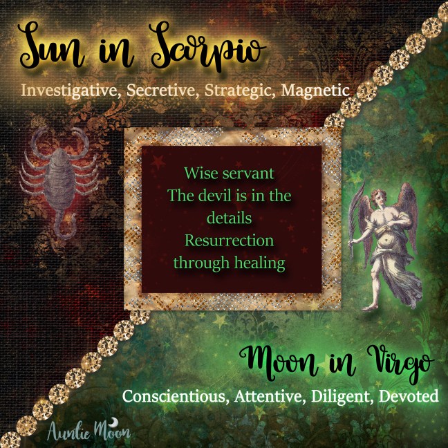 Moon in Virgo through November 6, 6:02a (ET) This duo, if turned into an inanimate object, would be the meticulously recorded alchemical text of a wise and charitable magician. The pairing of Sun in Scorpio and Moon in Virgo is similar to the investigative abilities we saw earlier in Scorpio/Gemini. Like Gemini, Virgo is under … Continue reading Sun in Scorpio ~ Moon in Virgo