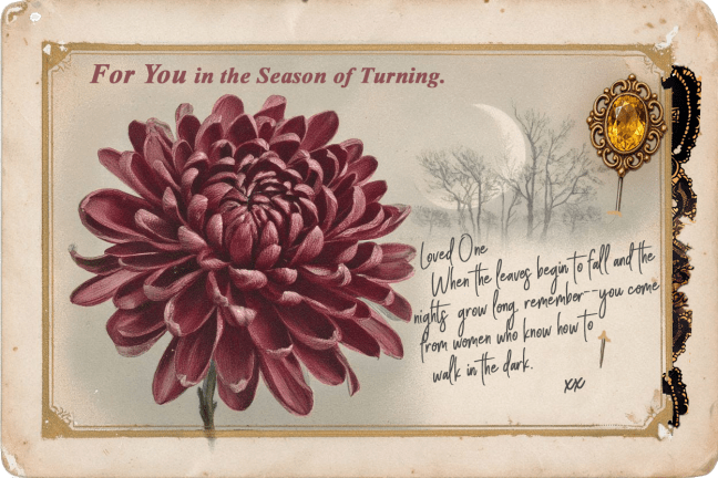 Today's offering is a new post style that I hope will inspire you at this New Moon in Scorpio. The post presents a brief fictional letter from Grandmother Moon, honoring the courage to begin again. It also acknowledges the transformative power of stepping into the unknown. The accompanying postcard is a talisman of sorts, a … Continue reading New Moon in Scorpio: Guidance from Grandmother Moon