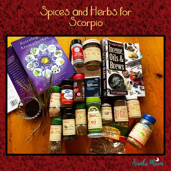 Scorpio gets lucky when it comes to ingredients for spell jars because so many herbs and spices fall under the rulership of Mars. Pluto is Scorpio’s modern ruler, but Mars has been with her since the constellations were placed in the sky. Here’s a pic of some of the herbs and spices for Scorpio from my own collection, as well as two recommendations for fantastic books to use when whipping up some sprinkling (or magick) powders and zodiac blends for essential oils.